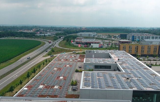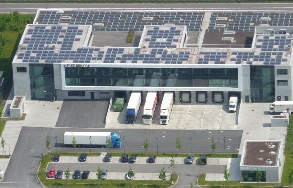 Nachhaltig konzipiertes Firmengebäude der Fa.Heiderbeck GmbH (Handel mit Käseprodukten) in 82140 Olching: Kühlhalle wird umweltfreundlich gekühlt mit Sole-Kälteanlagen (Kältemittel R290 Propan), Niedertemperatur-Abwärme wird zum Beheizen der Büros eingesetzt, PV-Anlagen erzeugen umweltfreundlichen und günstigen Strom für den Eigenbedarf, Speicherung von Überschussstrom mittels Latent-Wärmespeicher