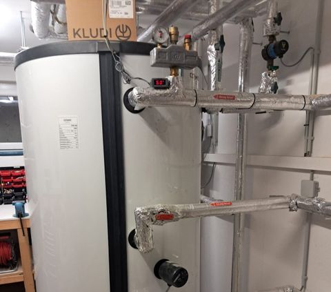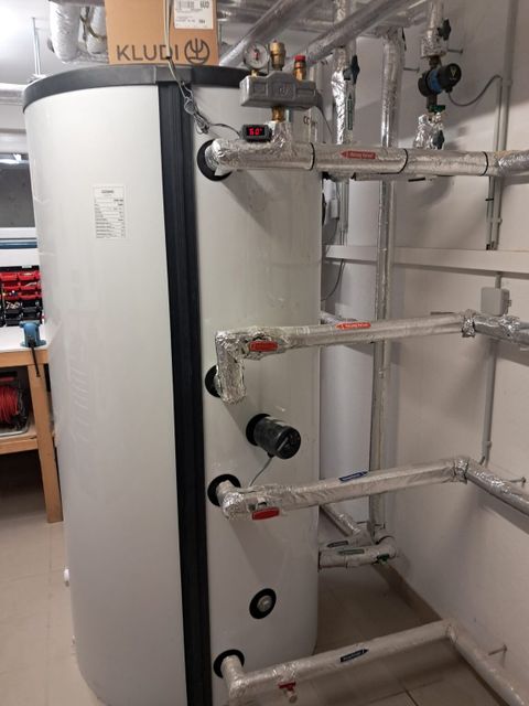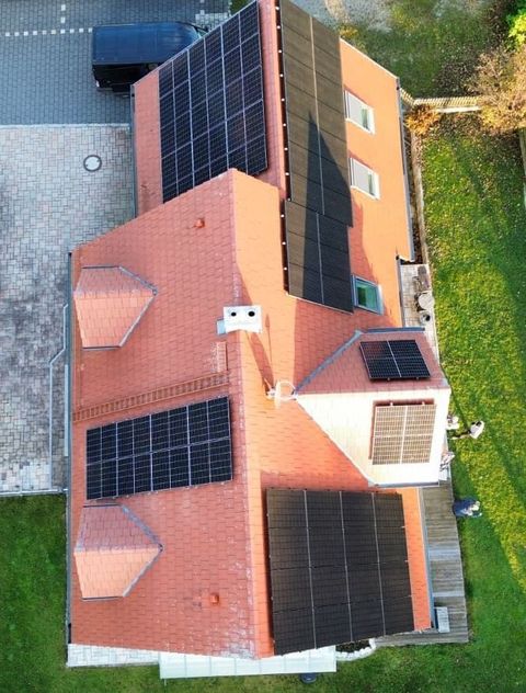 Eigenstromerzeugung mittels 20 kWp PV-Anlage und 12 kWh Batteriespeicher und 500 W Kleinwindrad, Wärmeversorgung aus Nahwärmenetz (Biogas-Anlage) und Kombination aus Heizschwert und Kaminofen mit Wassertaschen, Elektrofahrzeug mit 11 kW Wallbox für solares Laden