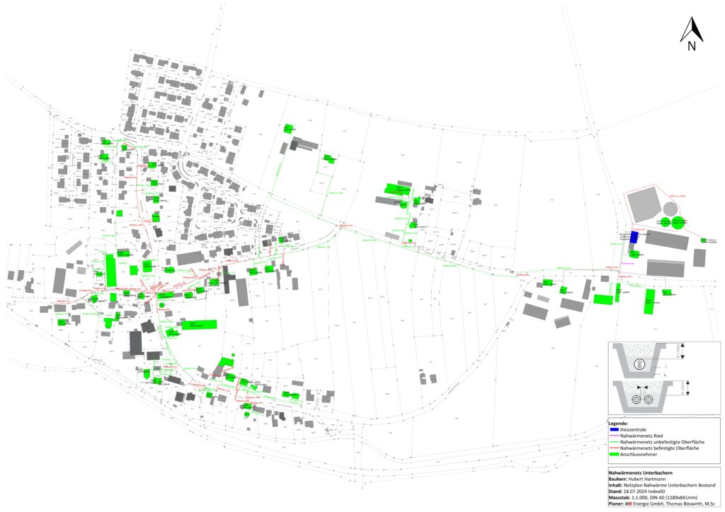 Nahwärme 85232 Unterbachern (2021-2024), Wärmeversorgung aus der Abwärme einer Biogasanlage sowie einer Hackschnitzel-Heizung, Versorgung von Wohngebäuden/Gärtnerei/Trocknung