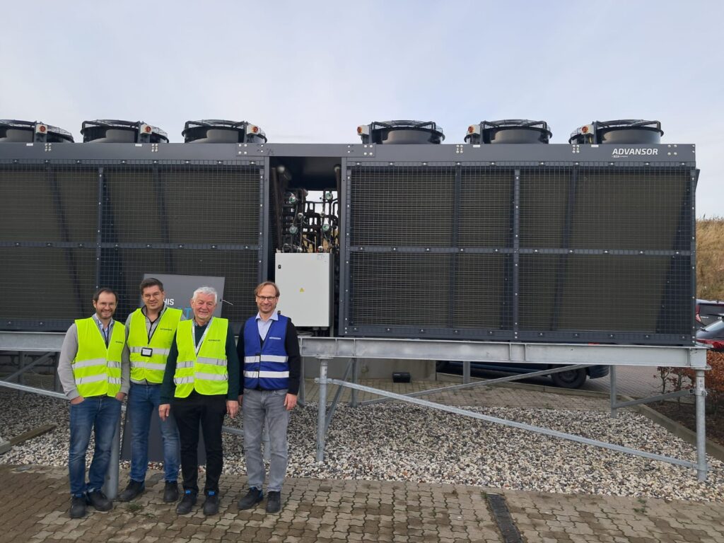 Das „dänische Modell“ – Wärmeerzeugung mit einer zentralen Luft-Wärmepumpe (hier 600 kW mit Kältemittel R744 CO2) in Verbindung mit einem großen Pufferspeicher und nachgeschaltetem Nahwärmenetz (niedrige Rücklauftemperaturen)