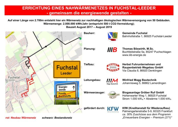 Nahwärme 86925 Fuchstal (Energiezukunft Fuchstal) – rund 200 Objekte sind über erdverlegte Kunststoffleitungen (PEXa) angeschlossen , Wärmeerzeugung aus einer 🌱Biogasanlage mit 🌲Hackschnitzelheizung, ⚡Power-to-Heat (PtH) (Umwandlung des überschüssigen ☀️PV- und Windstroms in Wärme), 🔥6.000m³ Pufferspeicher, 🔋 Batteriespeicher